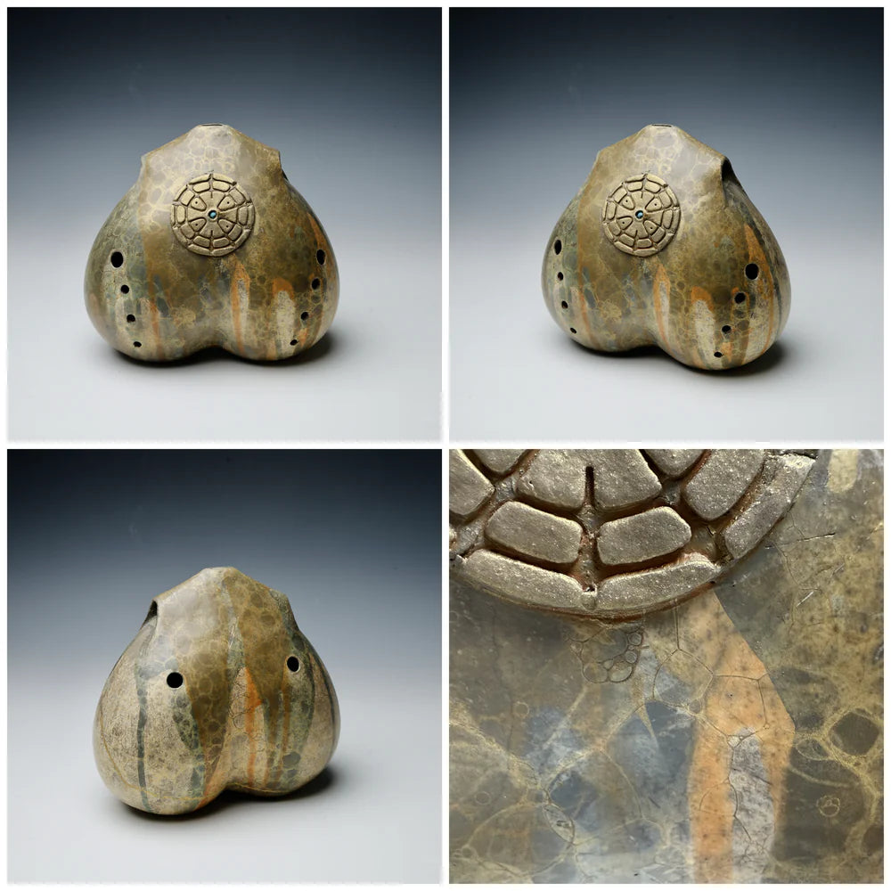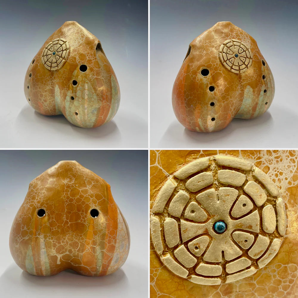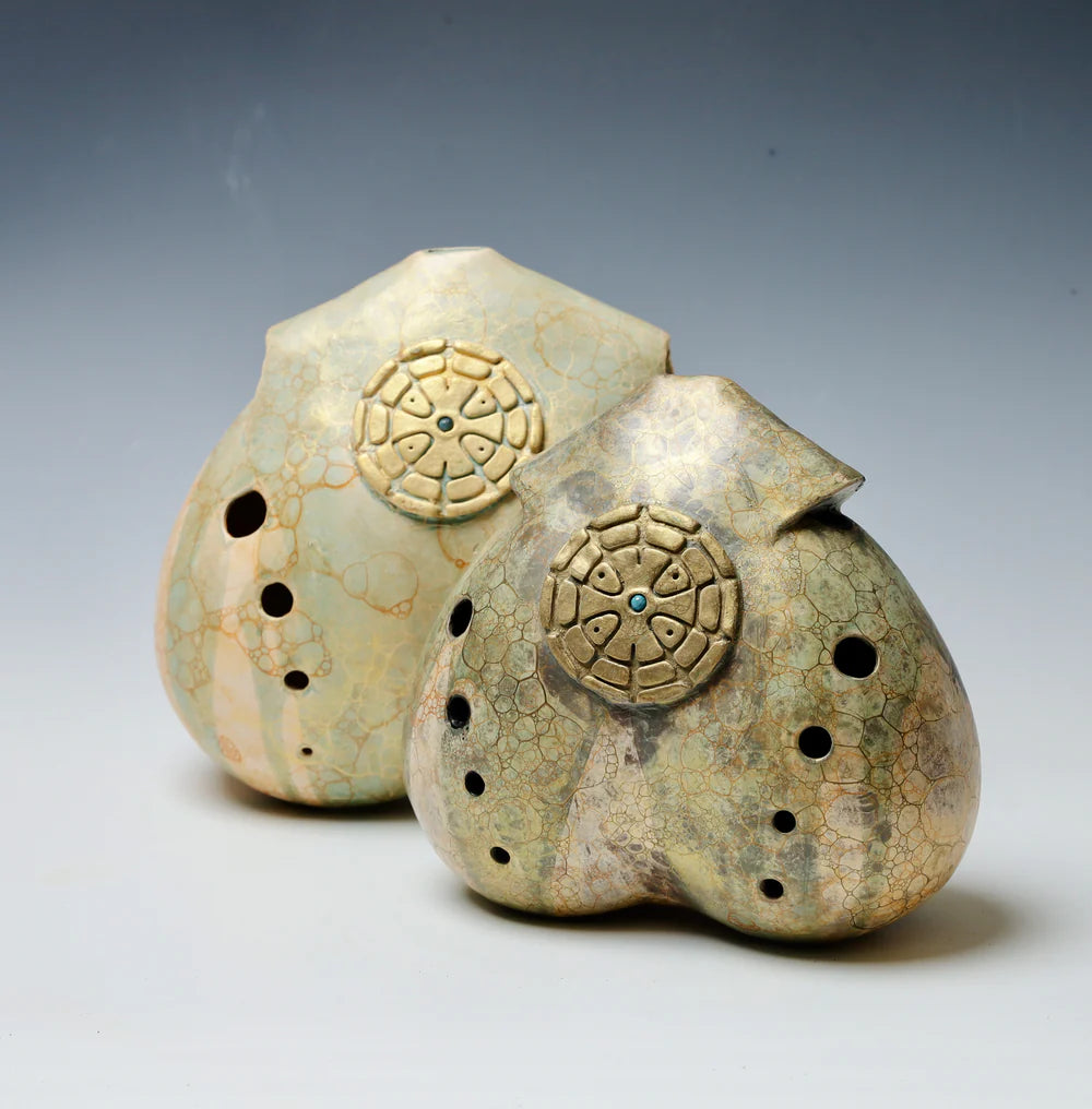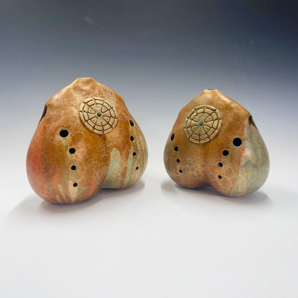 The Double can be understood as a double Natey flute: two flutes connected side by side, working together as one instrument. Each chamber features four finger holes on the front and a thumb hole on the back, allowing you to play a pentatonic scale on both flutes simultaneously.