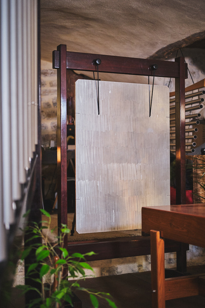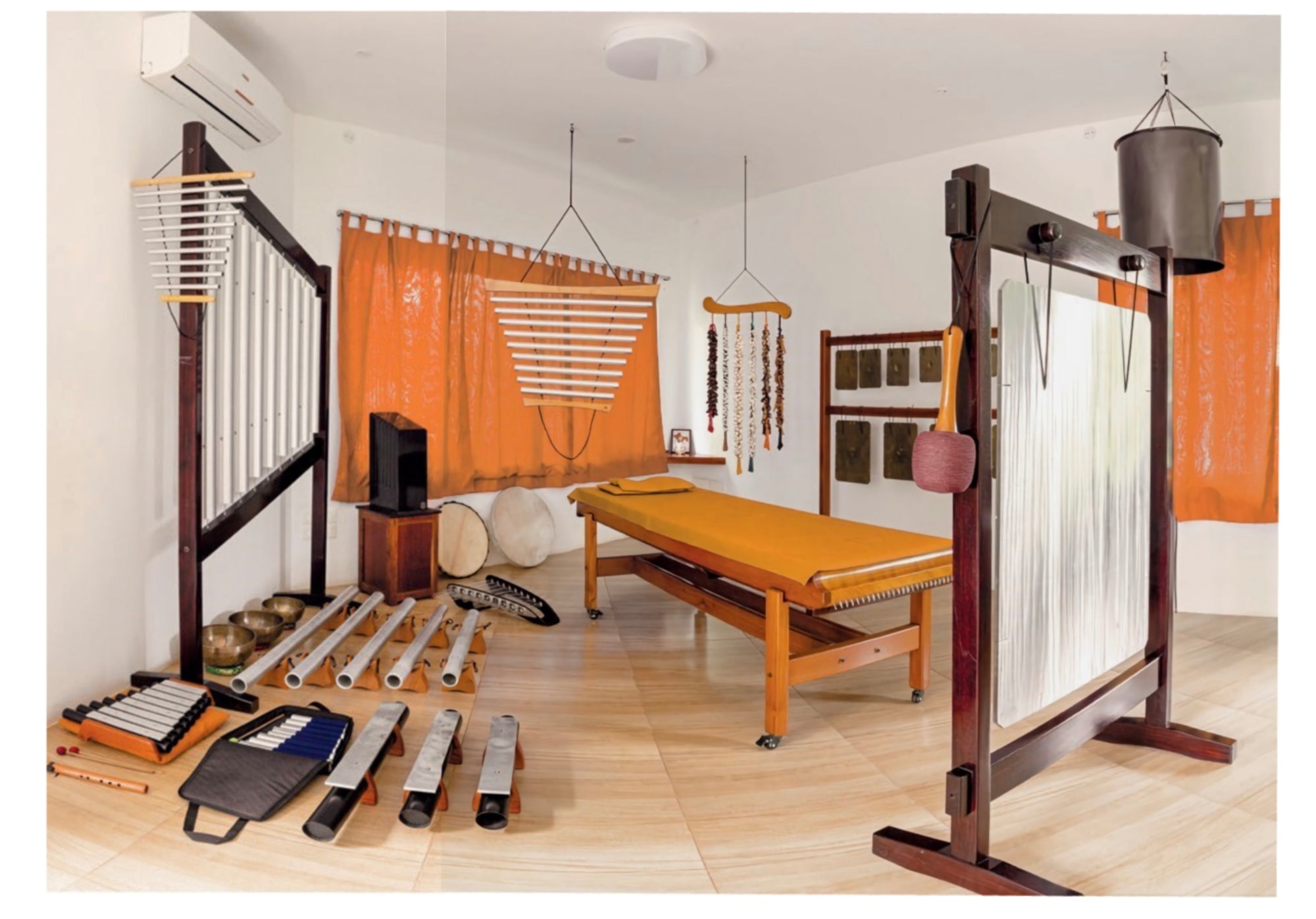 A configuration of selected and carefully manufactured ‘sound sources’, large scale instruments of diverse materials and qualities are grouped in an archetypal configuration around the central element of the Sound Healing Bed, which replaces the traditional massage table and offers a resting place for the sensory, receptive experience of a variety of sound textures and vibrations.