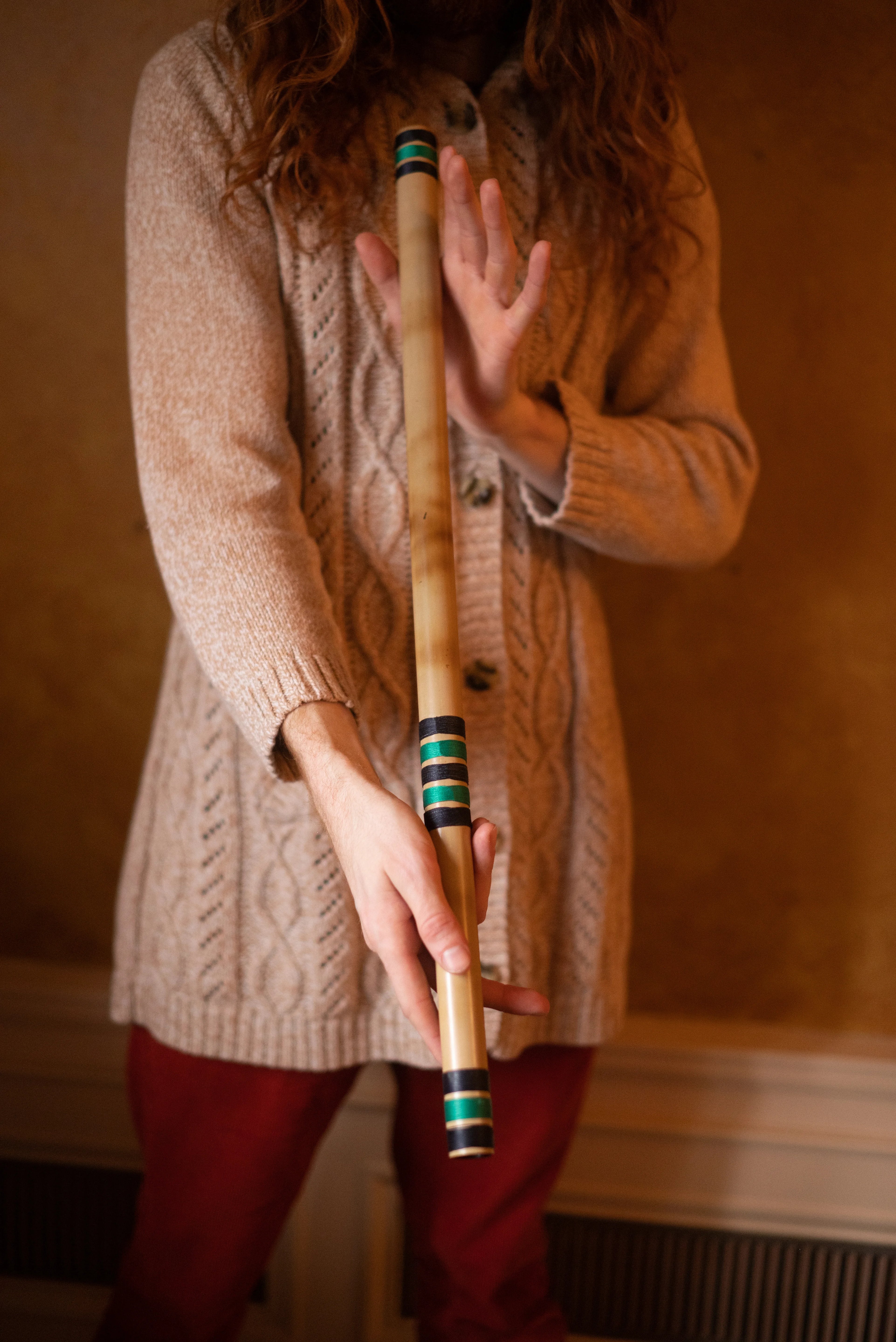 Depending on the model—bamboo or copper—the instrument allows access to up to 12 overtones. With no fingering and a simple mouthpiece, sound can be produced immediately, even by beginners. Through diaphragmatic breath control, increased air pressure naturally reveals higher overtones, inviting spontaneous and richly improvised play.